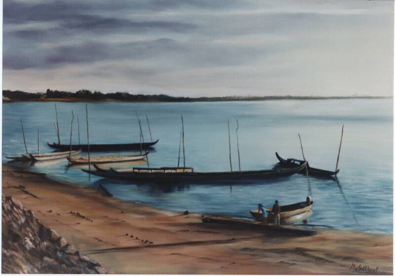 Vissersboten Curacao O Olieverf op linnen 40 bij 50 cm .